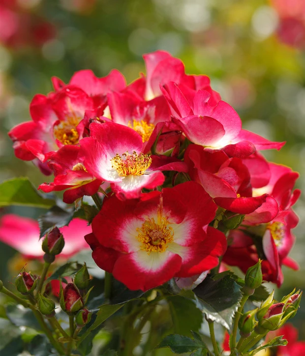 Wenn sich irgendwann im Juni die kräftig roséfarbenen Blüten der Beetrose ‚Loki®‘ öffnen und den Blick auf die strahlend weiße Blütenmitte freigeben, wird es kaum jemanden geben, der von diesem Anblick nicht fasziniert ist. Diese relativ neue Rosenzüchtung, die nach der Naturschützerin Hannelore (Loki) Schmidt benannt und in einer feierlichen Zeremonie im Loki Schmidt Garten in Hamburg getauft wurde, verfügt über eine fantastische Fernwirkung und ist ein Highlight in jeder Gartenanlage. Die offenen Blüten verleihen der Rose den malerischen Wildrosen-Charakter und halten zugleich viele leckere Mahlzeiten für Bienen, Hummeln und Schwebfliegen bereit, die gerne an dem gedeckten Tisch Platz nehmen und es sich schmecken lassen. Was Sie ebenfalls an der Beetrose ‚Loki®‘ schätzen werden, ist die ausgezeichnete Gesundheit dieser Züchtung, denn sie ist gegen Mehltau und Sternrußtau resistent. Lassen Sie sich bald von dem besonderen Charme dieser Rose bezaubern – in einem Gartenbeet oder auch im Kübel auf der Terrasse.