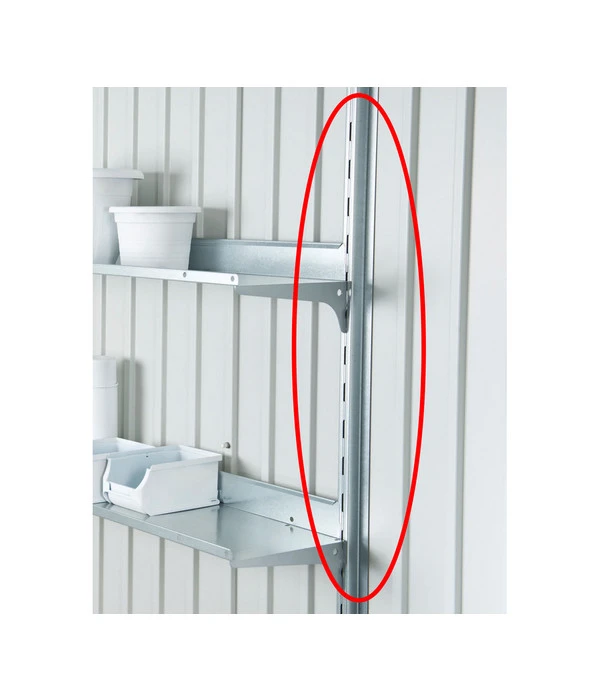 Mehr Stauraum für kleine Gartengeräte und Co. im Gerätehaus Europa von Biohort – die Regalsteher geben den Ablageflächen, die Sie ebenfalls im Sortiment finden, sicheren Halt und es lassen sich Regalböden in verschiedensten Höhen einhängen. Sie sind aus feuerverzinktem Stahl hergestellt und bieten zahlreiche Möglichkeiten zum Einhängen von Regalböden und den Klapptisch aus dem Hause Biohort.