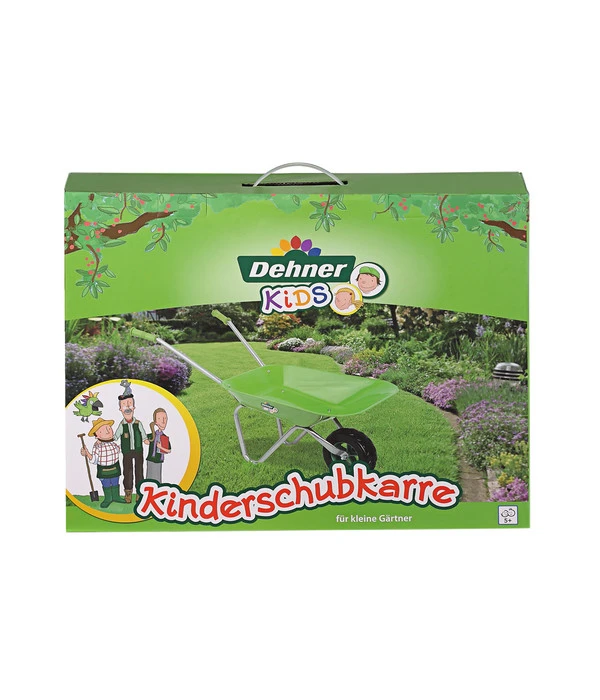 Die Dehner Kids Kinderschubkarre ist das ideale Präsent für kleine Hobbygärtner. Sie besteht aus pulverbeschichtetem Metall und verfügt über ein stabiles Rad aus Hartplastik. Ihr kindgerechtes Design in den Farben Grün und Silber wirkt besonders fröhlich und modern. An der Seite befindet sich das Logo der Marke Dehner Kids. Mit einer 6,5-Liter-Ladefläche und einer maximalen Belastbarkeit von 16 Kilogramm ist die Dehner Kids Kinderschubkarre für kleine Gartenarbeiten optimal geeignet. Aufgrund der komfortablen Plastikgriffe und der extra breiten Ausführung des Rades lässt sich die Kinderschubkarre leicht bedienen.