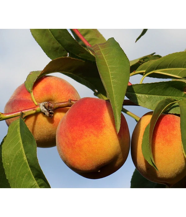 Läuten die Erdbeeren den Frühsommer ein, so sind Pfirsiche die Hochsommerfrucht schlechthin. Mit festem Fruchtfleisch und himmlisch saftiger Süße verwöhnt ein Gelbfleischiger Pfirsich den Gaumen jeden Obst-Gourmets. Die Krönung des Obstglücks aber ist es, wenn das Obst aus dem eigenen Garten stammt. Sie meinen: Pfirsiche wachsen doch nicht nördlich der Alpen? Das ist ein weit verbreiteter Irrtum. Es gibt viel mehr Gegenden und Standorte, als Sie glauben, an denen auch in Deutschland Pfirsiche zur Genussreife kommen. Setzen Sie gleich dieses tolle Obstgehölz in den Garten und freuen sich nicht nur auf den kulinarischen Genuss, den Ihnen ein Gelbfleischiger Pfirsich bietet, sondern erleben Sie auch die optische Bereicherung Ihrer Gartenanlage, denn vom üppigen, rosafarbenen Blütenflor im März/April über das schmale Laub bis schließlich zu den im Juli/August reifen Früchten ist ein Gelbfleischiger Pfirsich ein toller Hingucker!