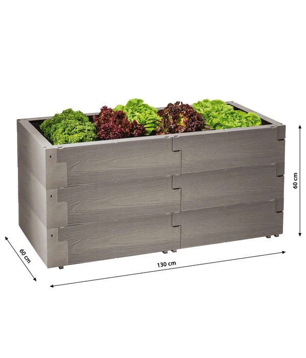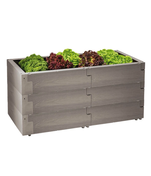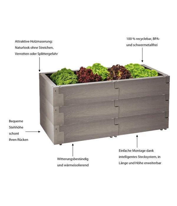 Ein Gemüsebeet in Stehhöhe schwebt Ihnen schon länger vor und je mehr Sie darüber nachdenken, desto mehr Vorteile fallen Ihnen ein. Denn als Sie das Juwel Hochbeet Timber 3-reihig gerade entdeckten, konnten Sie sich plötzlich genau vorstellen, wie üppig und appetitlich es bei Ihnen bewachsen sein könnte – mit knackigen Salaten, duftenden Kräutern, köstlichen Tomaten, leckeren Zucchinis und vielleicht sogar mit ein paar Besonderheiten wie Süßkartoffeln und Co. Und als Sie sich dann bewusst machten, wie bequem das Pflegen und dann auch das Ernten im Stehen sein würden, war es um Sie geschehen. Bestimmt interessiert es Sie außerdem brennend, dass es sich hier um kein typisches Holzhochbeet handelt, sondern um ein intelligentes Stecksystem aus witterungsbeständigen Kunststoffelementen. Das birgt gleich mehrere Vorzüge, wovon die attraktive Holzmaserung nur der erste ist. Greifen Sie also zu und bauen schon bald Ihr Juwel Hochbeet Timber 3-reihig bei sich auf!