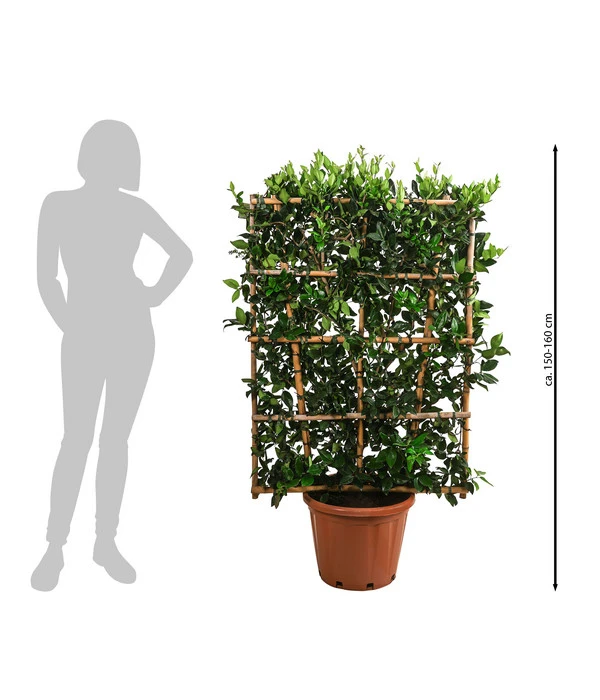 Abertausende von dunkelgrünen, glänzenden kleinen Blättern, die eine dichte, blickdichte Sichtschutzhecke bilden – davon träumen Sie? Und zwar von einer Hecke, die ganz schnell hoch und dicht ist? Dann nehmen Sie den Liguster ‘Texanum‘! Dieser hat schon eine ansehnliche Höhe von 150-160 cm erreicht und außerdem haben wir ihn am Spalier kultiviert, sodass Sie ihn sofort nach dem Kauf als Abgrenzung nutzen können. Die kräftige, wuchsfreudige Pflanze wird schnell in die Höhe und in die Breite wachsen, sodass Sie schon in kurzer Zeit die gewünschte grüne Sichtschutzwand haben. Und die Liguster ‘Texanum‘ gehört sogar zu den sogenannten wintergrünen Pflanzen, die ihr Laub erst im Frühling zum Neuaustrieb der frischen Blätter abwerfen. Im Sommer wird Sie das attraktive Ziergehölz außerdem mit weißen, rispenförmigen Blüten erfreuen, die einen angenehmen Duft im Garten verbreiten. Entscheiden Sie sich für den Liguster ‘Texanum‘ – er wird Sie nicht enttäuschen!