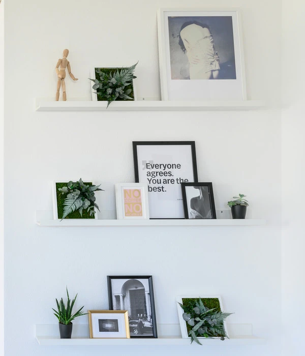 Ganz gleich, ob es sich um so exotische Blattschönheiten wie den prachtvollen Japanischen Farn und die silbergrün schimmernden Blätter des Eukalyptusstrauchs oder um die heimischen Vertreter wie Wald- oder Kugelmoos handelt – alle Pflanzen stellen keine Ansprüche mehr an Sie, d.h., sie müssen nicht gegossen werden, sondern bleiben ganz von allein jahrelang frisch und grün. Und weil die Pflanzen auch antistatisch sind, wird sich nicht einmal Staub auf dem Bilder-Set im Dschungeldesign ansammeln. Gefasst wird die Pflanzen-Arrangement jeweils von einem weißen Rahmen aus FSC-zertifiziertem Holz.