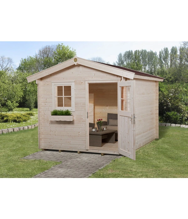 Gartenhaus in stabiler Blockbohlenbauweise, 28 mm Wandstärke, mit 19 mm Massivholzdach und Massivholzboden