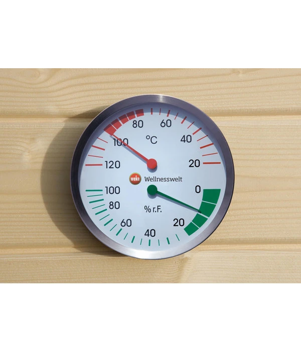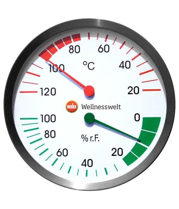 Wieviel Hitze Sie vertragen, und wie feucht oder trocken die Luft sein darf, das empfindet jeder Mensch anders. Auch vom individuellen Befinden hängt es ab, und ob Sie das regelmäßige Saunieren gewohnt sind. Der Weka Klimamesser ist deshalb ein unverzichtbares Utensil in Ihrer Sauna, Ihrem Sanarium oder Dampfbad. Mit ihm haben Sie sowohl Temperatur als auch Luftfeuchtigkeit im Blick und können jederzeit regulierend auf das Klima einwirken.