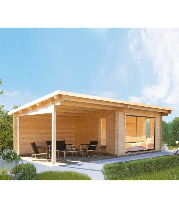 Das Wolff Finnhaus Gartenhaus Trondheim 70-D, inkl. Lounge 400 links ist nicht nur – wie alle Holzhäuser von Wolff Finnhaus – aus hochwertigem Nordischem Holz und in bester Verarbeitungsqualität gefertigt – die Wandbohlen sind bei diesem Haus 70 mm stark und isolieren so gut, dass Sie sich auch zu anderen Jahreszeiten gerne in dem Haus aufhalten werden. Zumal durch die spezielle Montageart eine wind- und regendichte Verbindung in den Ecken gewährleistet wird und die bodentiefen Fenster isolierverglast sind.