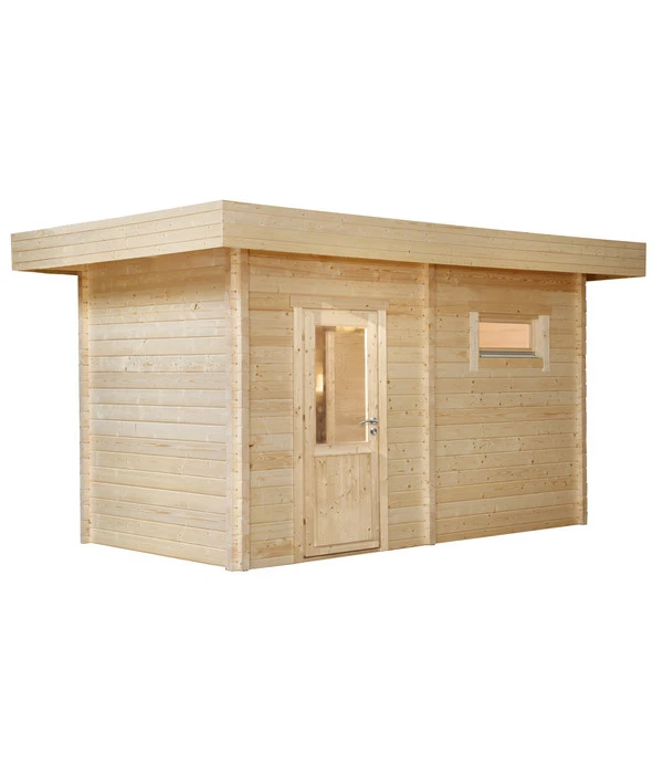 Wussten Sie, dass der Begriff „Saunaˮ aus Finnland stammt und übersetzt „Schwitzstubeˮ bedeutet? Der Trend des gesunden Schwitzens erreichte Deutschland bereits im Jahr 1936, als im Olympischen Dorf in Berlin eigens für die finnischen Sportler eine Sauna erbaut wurde. Heute sind die Deutschen „Vizeweltmeisterˮ im Schwitzen und gönnen sich mit Bauwerken wie dem Finnhaus Saunahaus de luxe Mikko 70 Halbglastür sogar immer häufiger ihre ganz privaten Wellness-Ressortsin ihren Gärten. Ein Trend, dem Sie sich mit diesem Design-Highlight sofort anschließen sollten. Es besticht mit seiner modernen, kubischen Bauweise und einem bewusst dominant gestalteten Dach und wirkt damit schlicht-zurückhaltend und auffallend modern gleichermaßen. Für die nordisch einladende Wirkung ist die Blockbohlenbauweise aus naturbelassenem Holz verantwortlich und das Finnhaus Saunahaus de luxe Mikko 70 Halbglastür hält im Innenraum, was es von außen verspricht!